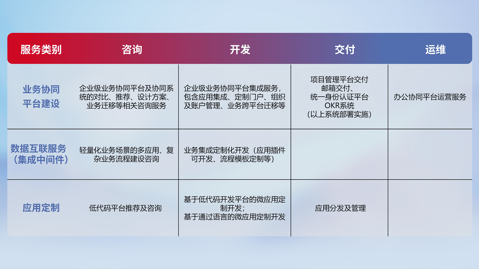 针对钉钉、、、、企微、、IDaas等平台级产品提供产品的规划、、、方案、、交付、、、、定制化开发等服务,,,,实现如统一协同办公、、、智能客户服务、、、、混合会议管理、、、、智能数据查询、、、、等业务场景,,实现数字化转型。。。。